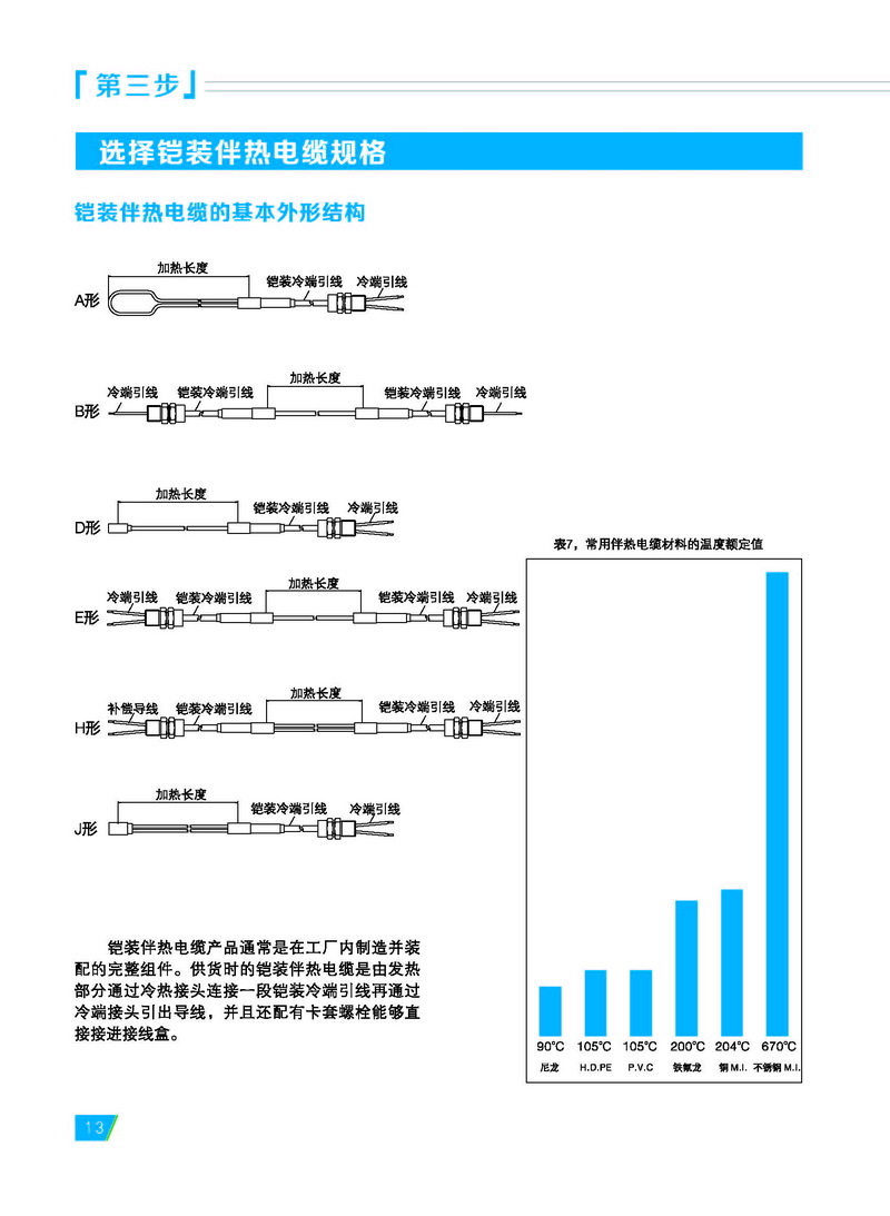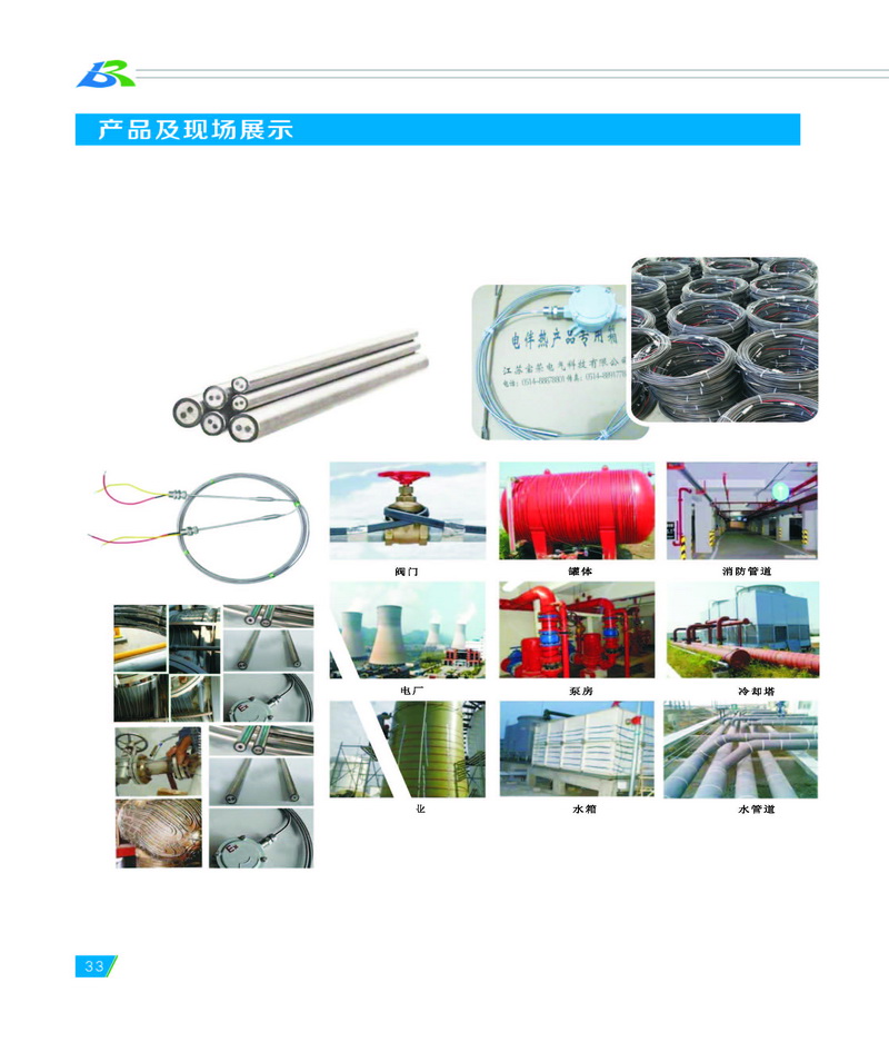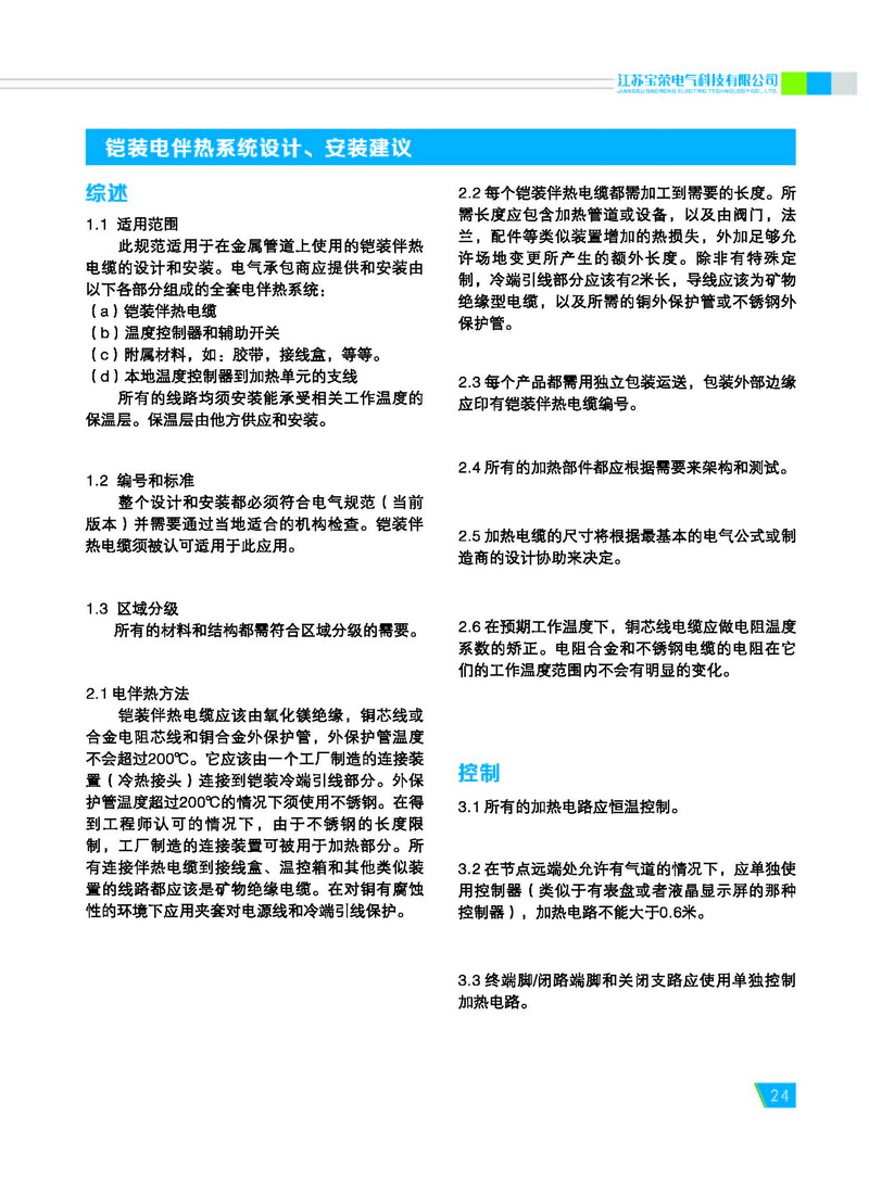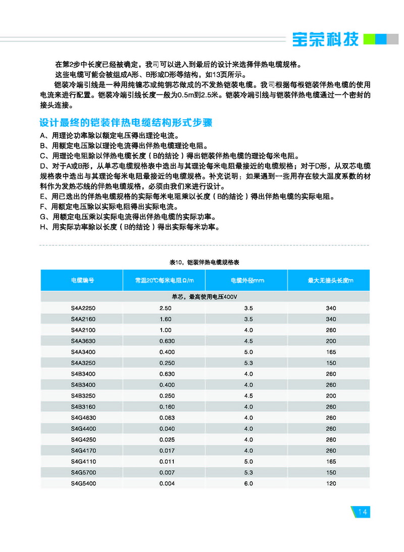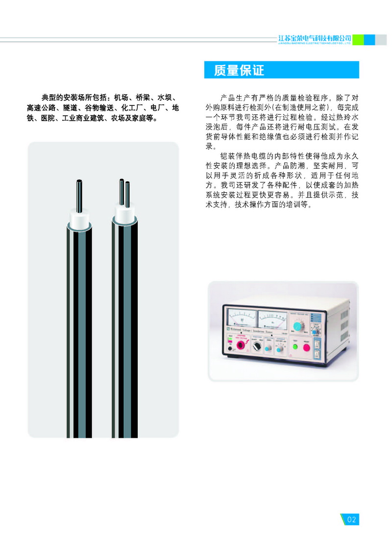 宝荣电气专业生产不锈钢保护管或铜 保护管的铠装伴热电缆,又称为铠装电热 电缆或矿物绝缘伴热电缆。 铠装伴热电缆包含一个到两个导体 (芯线)。该导体被嵌入高度压缩的矿物绝 缘材料(氧化镁)中,并同时被不锈钢或铜 制成的无缝金属套管保护。金属外保护管 和导体的材料均根据需要选择。