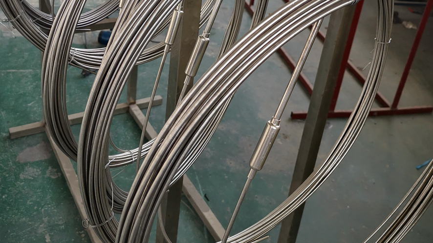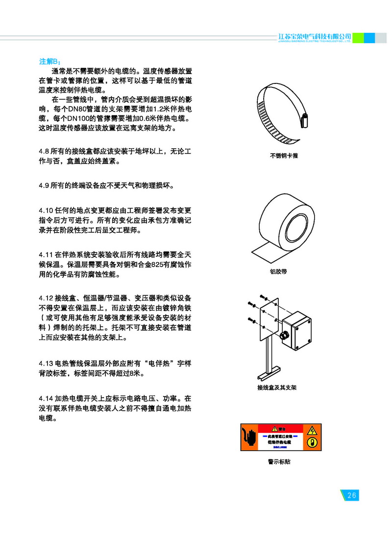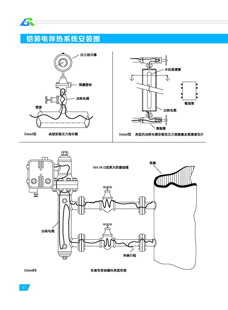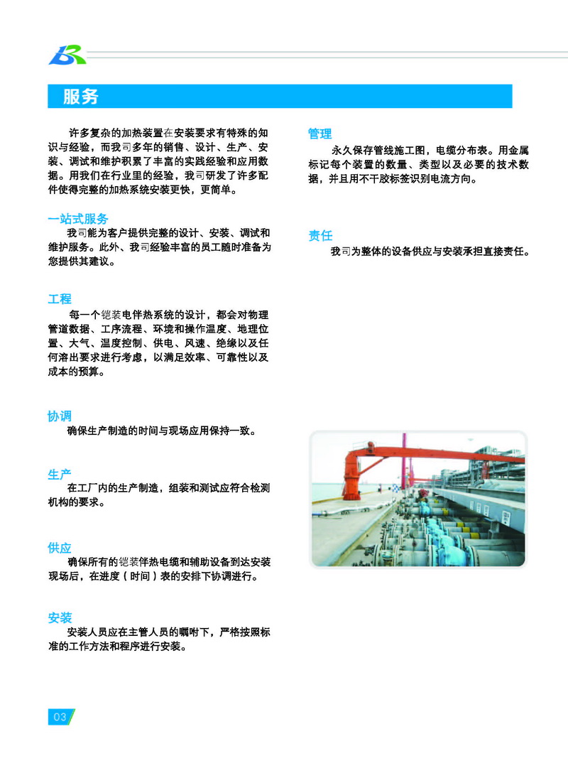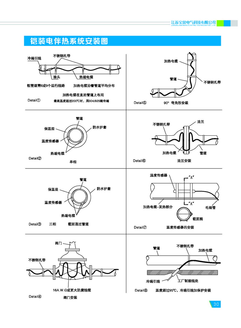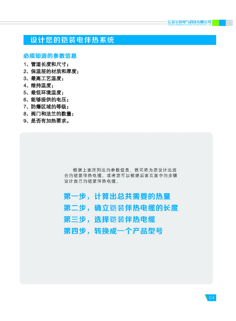 宝荣电气专业生产不锈钢保护管或铜 保护管的铠装伴热电缆,又称为铠装电热 电缆或矿物绝缘伴热电缆。 铠装伴热电缆包含一个到两个导体 (芯线)。该导体被嵌入高度压缩的矿物绝 缘材料(氧化镁)中,并同时被不锈钢或铜 制成的无缝金属套管保护。金属外保护管 和导体的材料均根据需要选择。